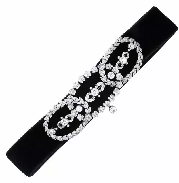 典型的代表是宽领式项链,这种围颈式项链由维多利亚时期的薄纱变成了黑天鹅绒底衬或者有别扣的丝带,中间装饰着花朵或者带扣,有时候也是单纯铂金镶嵌,上面加上珍珠以及钻石点缀,这不是现在流行趋势正猛的“狗带”吗?