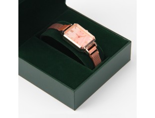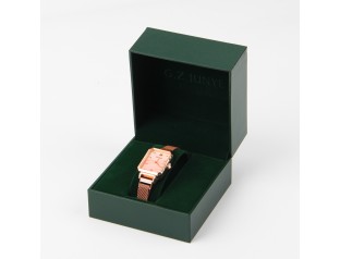 此款手表包装盒采用了PU皮包胶胚,内置白色EVA内托,可用于手链或手表的包装手表盒设计整体采用了红色作为盒子主打色,可以很好的吸引消费者的注意。手表盒四边金黄色的线条边沿与红色搭配给人一种很强的视觉冲击感,华丽而不沉闷。