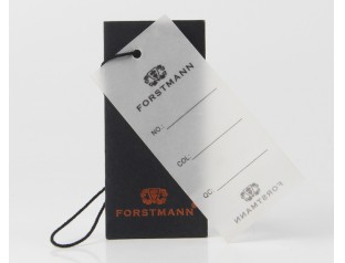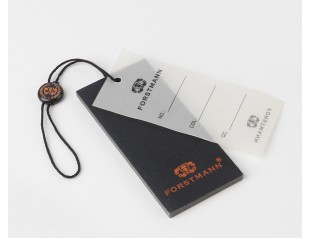 此款衣服吊牌制作采用黑卡纸,商标烫红金,加上一张PVC塑料片。