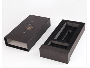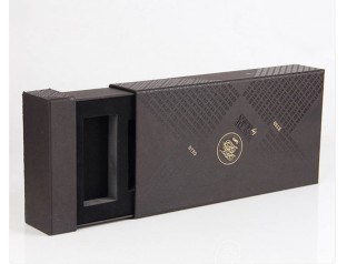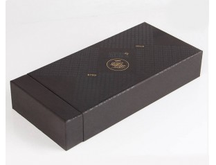 这个礼品盒定制选用的材质是1000可白板纸为内纸,裱纸则是双铜纸,盒型是抽屉盒,盒身覆哑胶,看起来高贵神秘;可以看到这个礼品盒的表面布满了用uv印刷出来的文字,在不同的角度可以看到不一样的效果,这也是防伪的一种方法;盒子的logo采用的是烫金工艺,金灿灿的字体往往能让人印象深刻,同时也凸显了品牌质感。